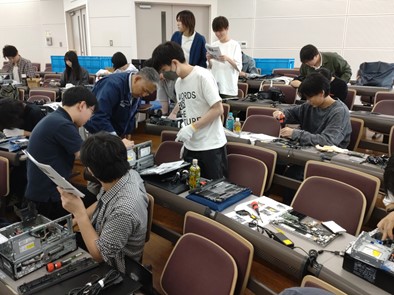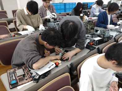 デスクトップパソコンとノートパソコンとの2種類のパソコンを解体・組立し,パソコンの構造と,種類の違いによる設計の違いとを学びました。また,この体験会には他コースに所属する学生も参加し,コースを超えた交流をおこないました。